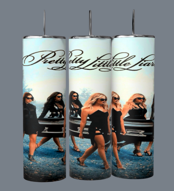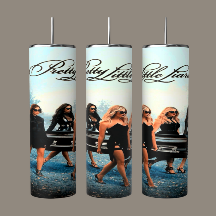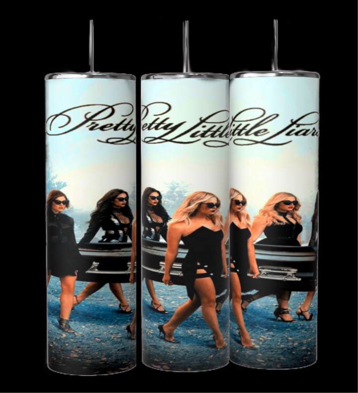 The PLL 20oz Tumblers by Kreative Kreationz feature an image and title from Pretty Little Liars. The design displays four women in black dresses and sunglasses walking confidently, with the show's title written in elegant script above them. These tumblers keep beverages hot or cold, making them perfect for any fan of the show.