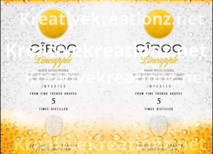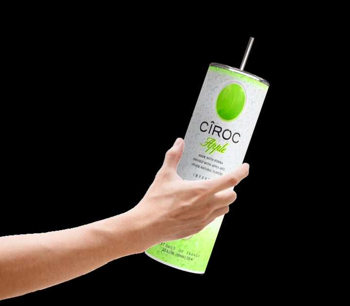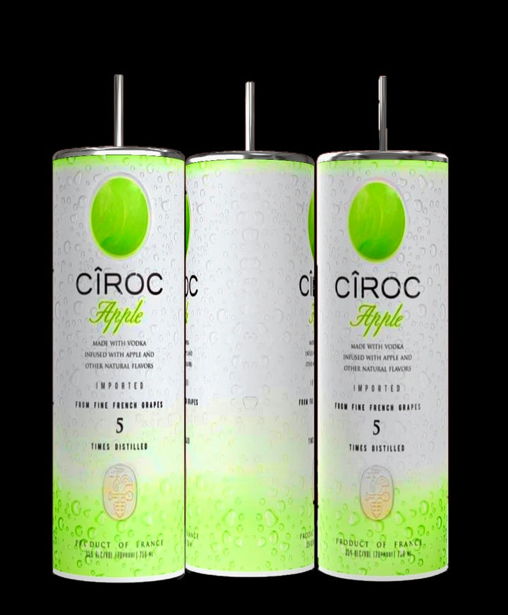Under the brand Kreative Kreationz, the Ciroc Tropical Template 4 pack includes SVG, DTF transfer, and PNG files ideal for tumbler wrap designs. Among them are two digital renderings of CÎROC vodka bottles with an apple flavor theme, featuring a vivid green apple graphic. The design emphasizes that the vodka is crafted from fine French grapes and distilled five times, complemented by water droplets to enhance its fresh appeal.