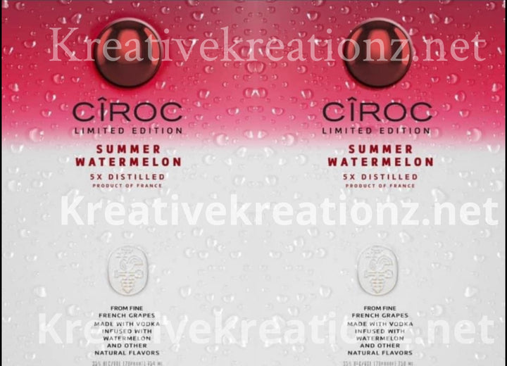 Image of two boxes from the Ciroc Tropical Template 4 pack by Kreative Kreationz, showcasing a design with droplets and a red berry graphic set against a white and red gradient background. The text emphasizes the use of premium ingredients, distillation details, and French grapes, making it ideal for crafting Ciroc templates or designing custom tumbler wraps.