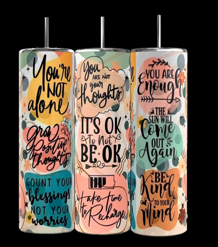 Discover the "It’s Ok Not To Be Ok Affirmations 20oz Skinny Tumbler" by Kreative Kreationz—a trio of stainless steel tumblers. Featuring quotes: "You're not alone," "You’re not your thoughts," and "You are enough," these eco-friendly treasures inspire with colorful floral designs.