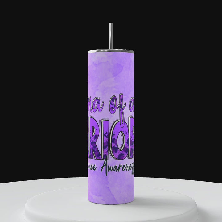 Three 20oz purple tumblers by Kreative Kreationz feature "Mama of a Warrior" and a ribbon symbol for Domestic Violence Awareness. The design includes varied purple shades and textured patterns, ideal for any collection.