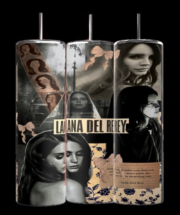 Kreative Kreationz's Lana Del Ray Tumbler set includes three tall, reusable stainless steel tumblers with sepia-accented collages, black-and-white Lana Del Rey portraits, vintage florals, and her bold name for a nostalgic vibe.