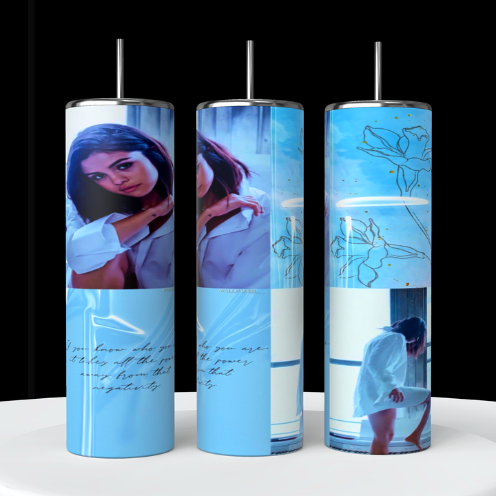 Presentamos nuestro vaso de acero inoxidable Selena Gomez Blue Collage de 20 oz, una adición elegante y con estilo a su colección de bebidas.