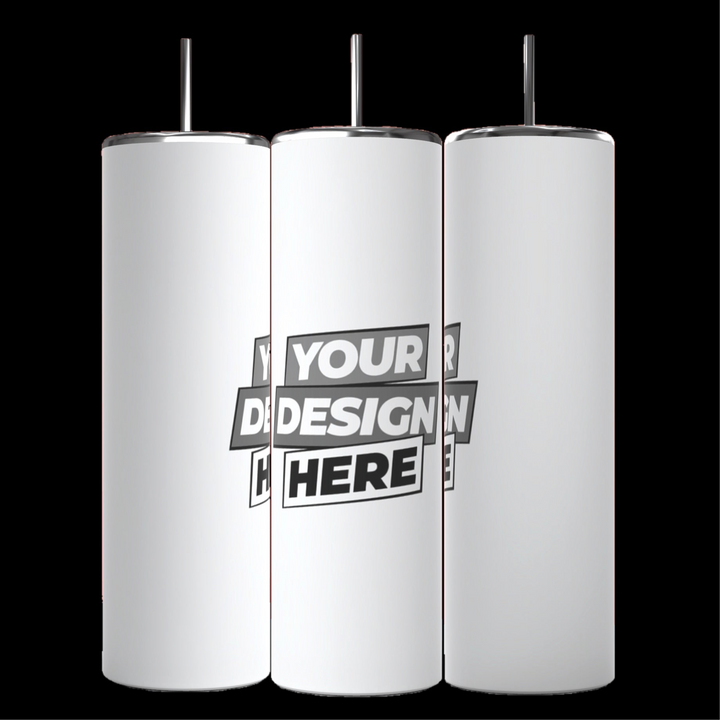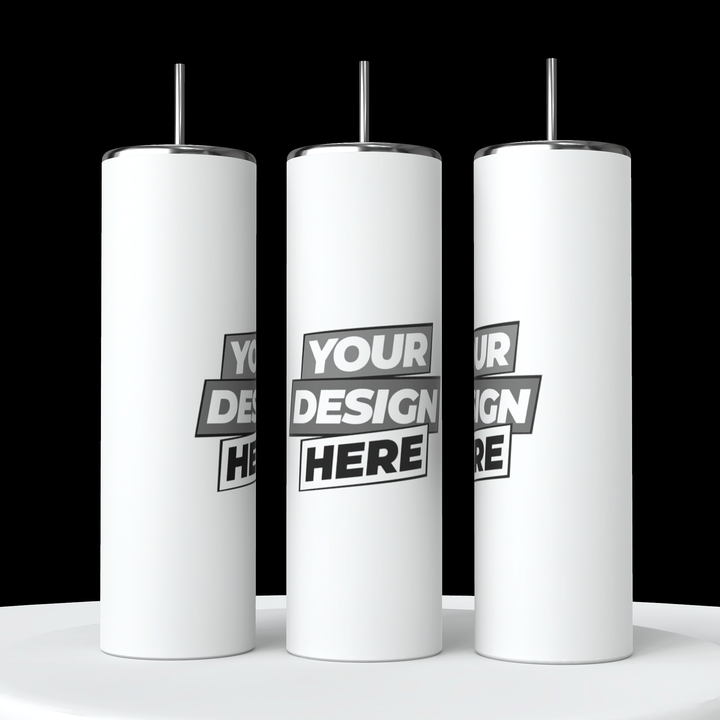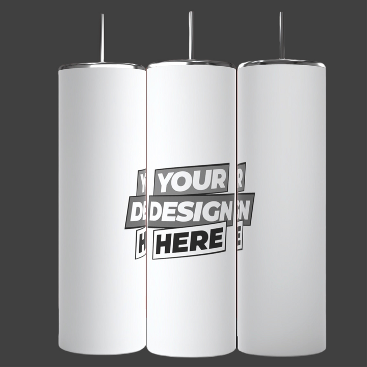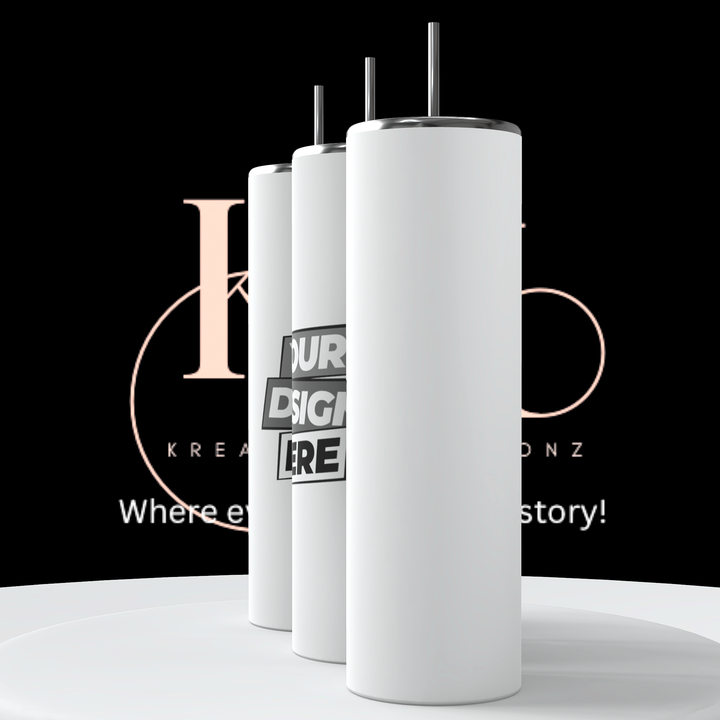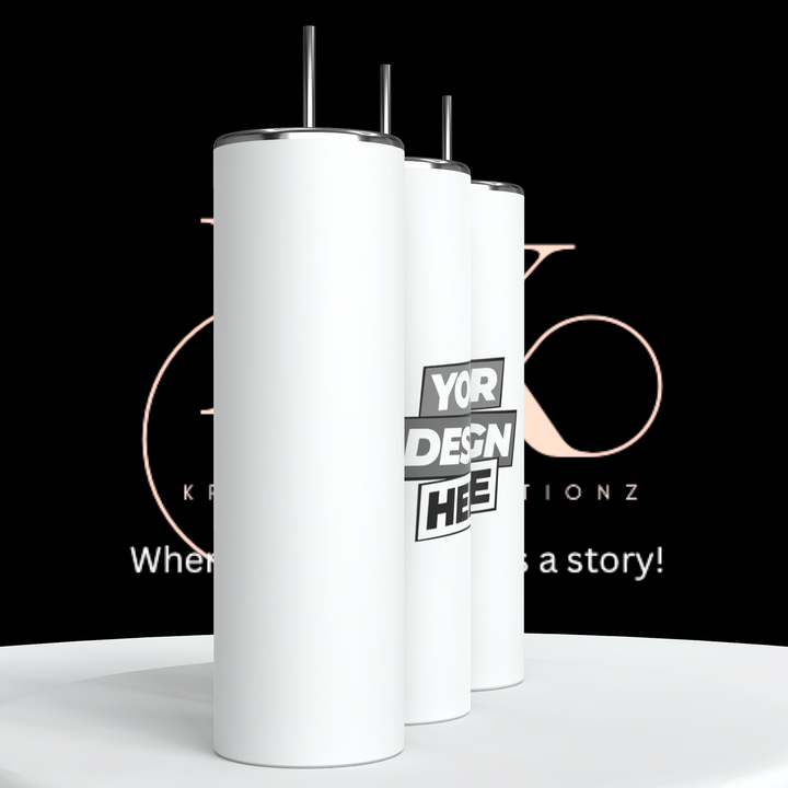 Three Kreative Kreationz Custom 20oz Skinny Tumblers with metal straws are displayed on a black background. Each eco-friendly, reusable white tumbler shows “YOUR DESIGN HERE” in bold black and gray text on the front.