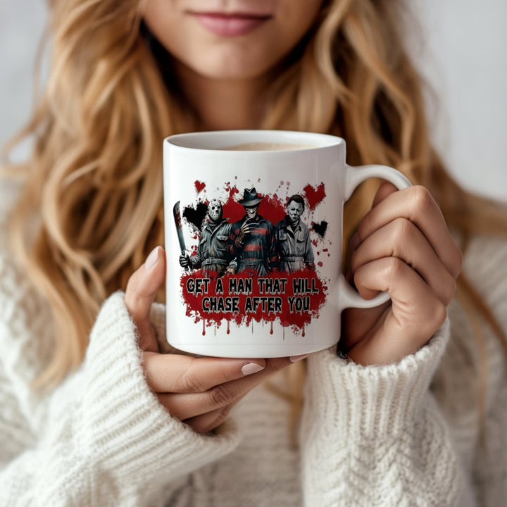 A person holds the "Get a man who will chase after you" Halloween Ceramic Mug by Kreative Kreationz, featuring three horror characters with weapons, a splattered red background—perfect for spooky coffee moments.