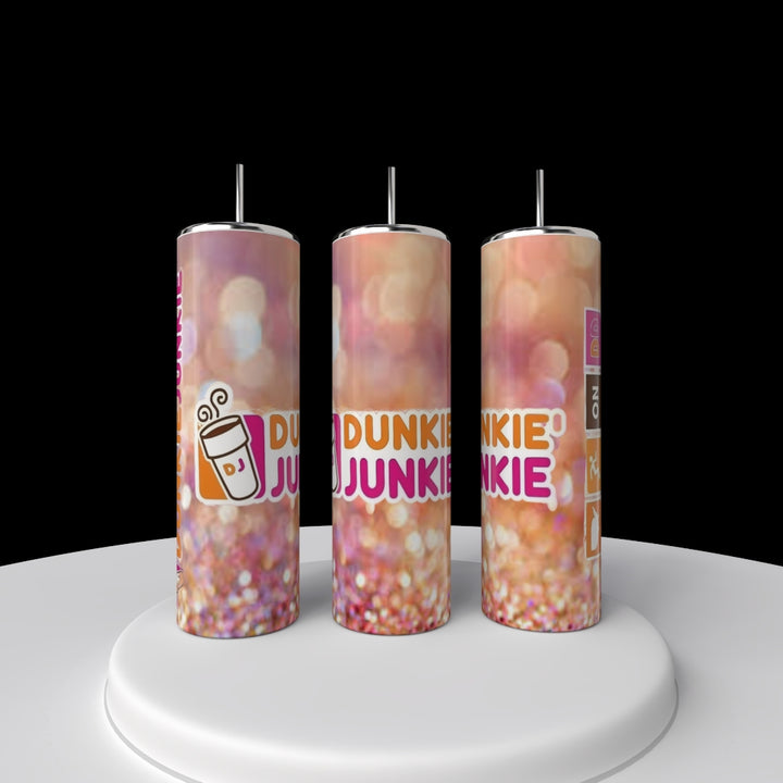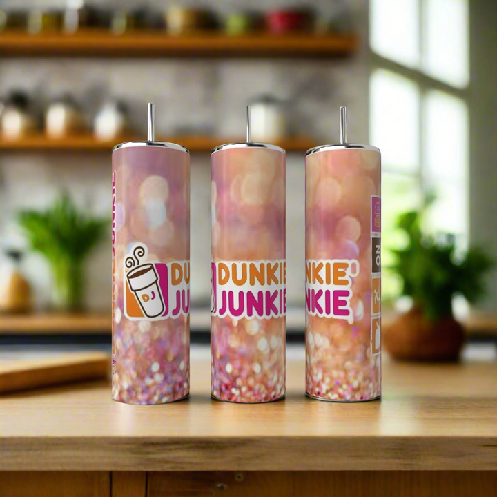 Three Kreative Kreationz Dunkin Junkie 20oz Tumblers with reusable straws sit on a counter. Each features a pink, orange, and white gradient design, “DUNKIN JUNKIE” text, and a coffee cup graphic for a fun touch.