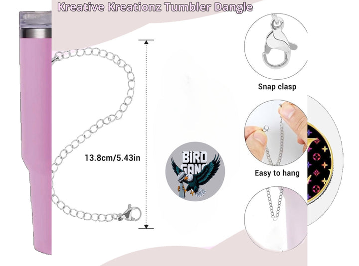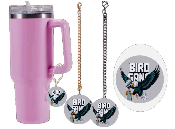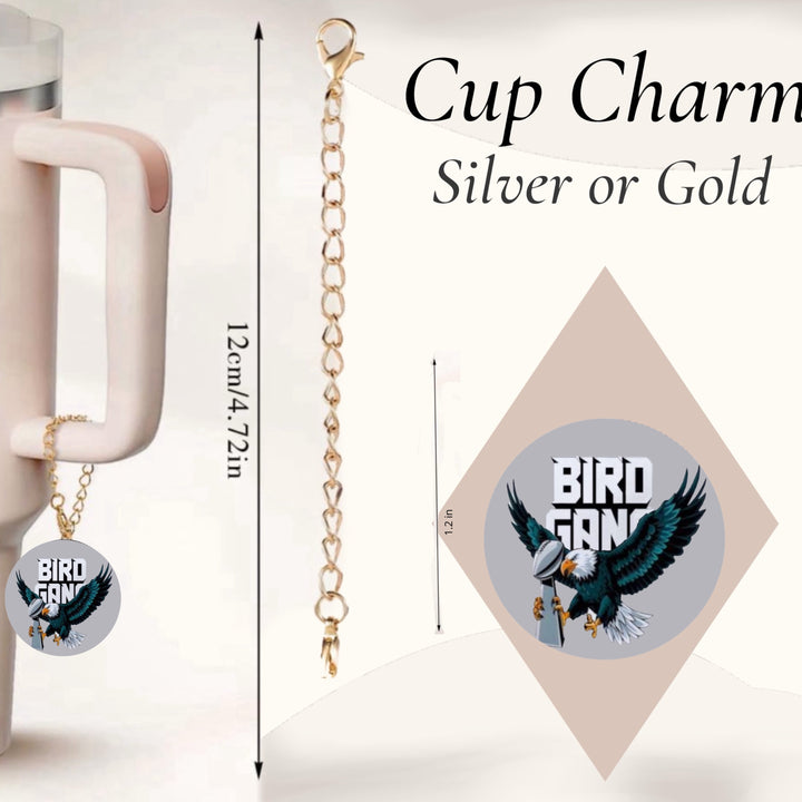 Showcasing the Eagles Bird Gang Charm Dangle by Kreative Kreationz: a white cup with a “BIRD GANG” pendant charm attached in two ways to the handle, above and below. Text reads, “2 ways to decorate your cup!”.