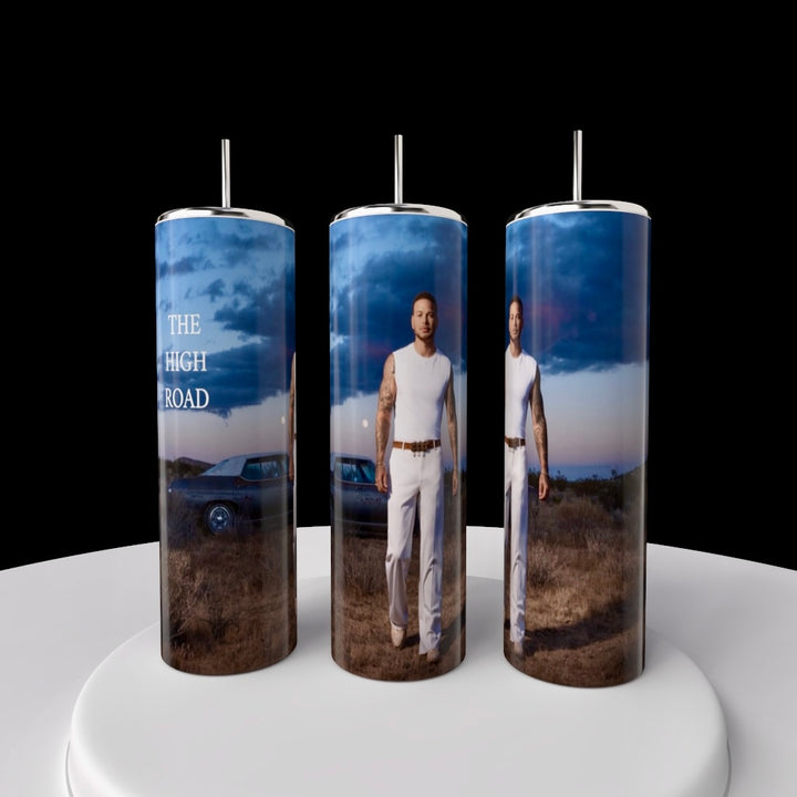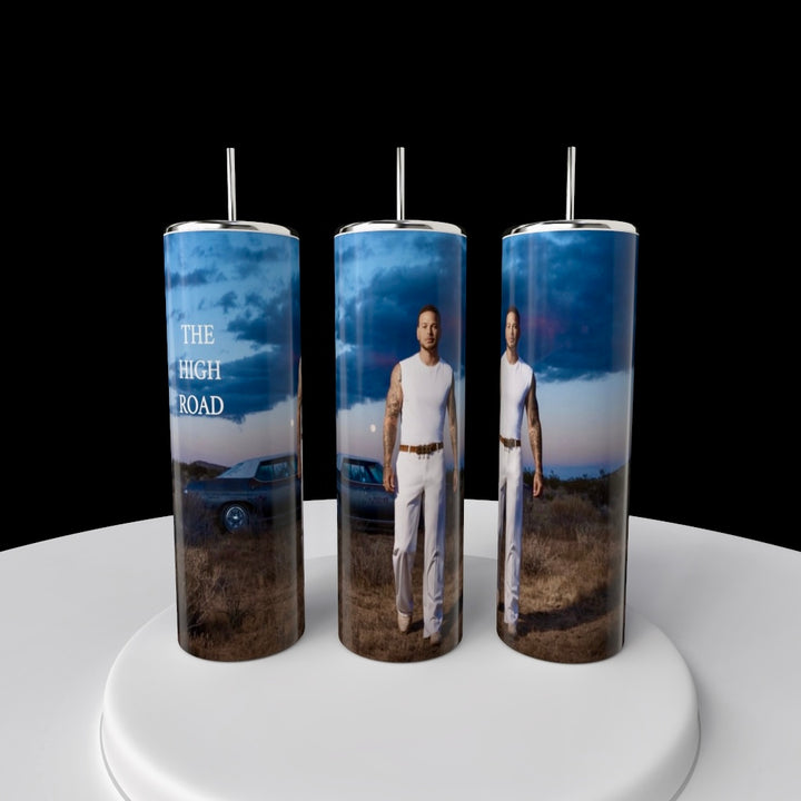 Three Kane Brown The High Road 20oz Tumblers by Kreative Kreationz are displayed outdoors, featuring lids and straws. They depict a man in a white outfit, a classic car, and "THE HIGH ROAD" text against a sky backdrop, with the blurred natural setting enhancing these eco-friendly reusable pieces.