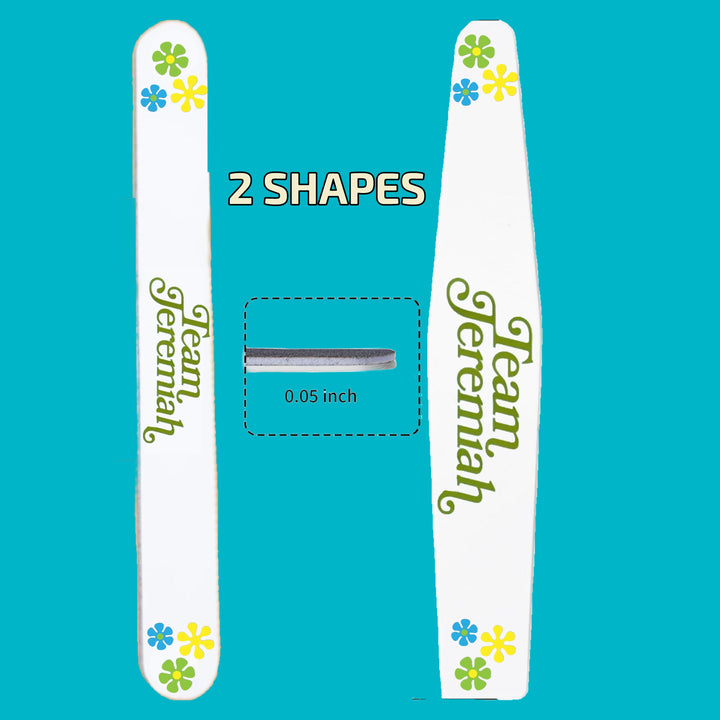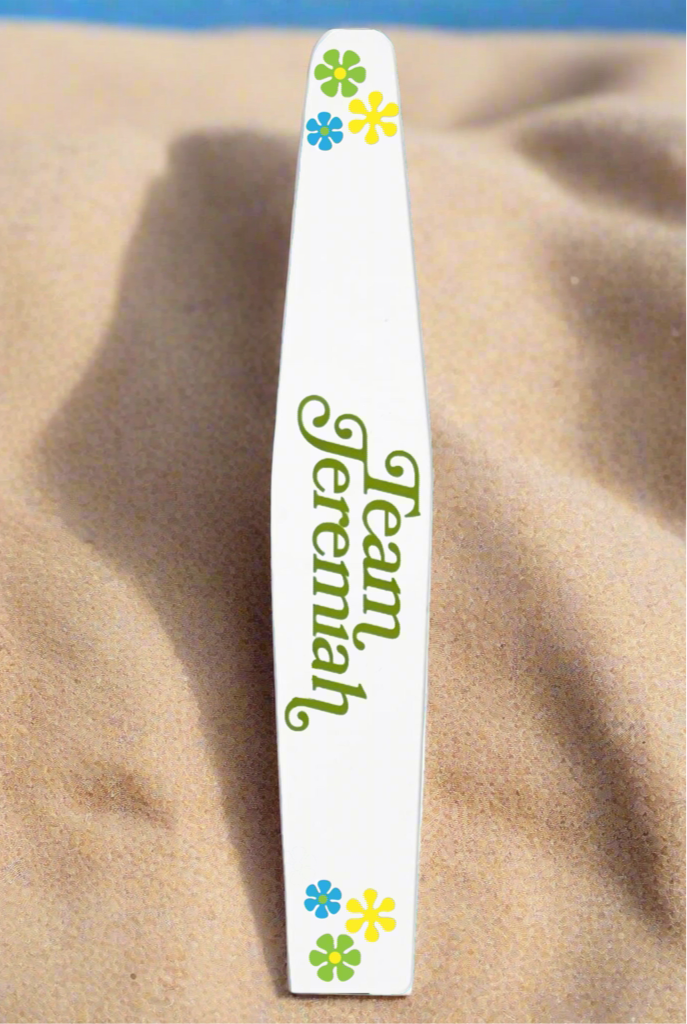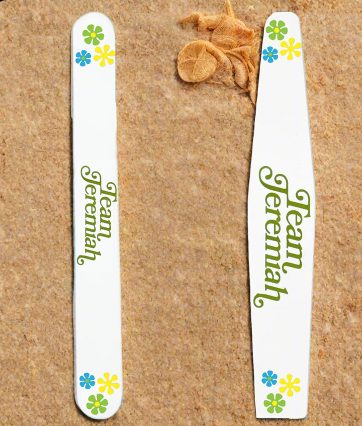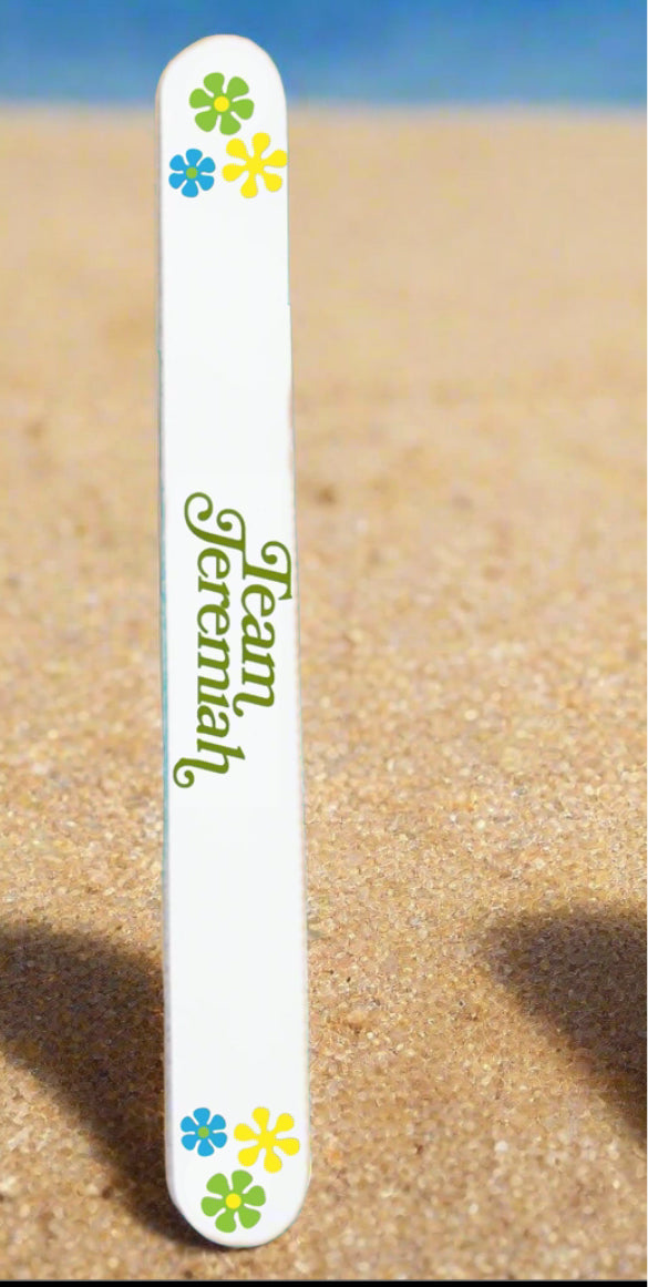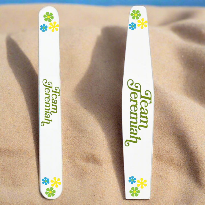 Two Kreative Kreationz Team Jeremiah Ceramic Nail Files featuring green text and colorful flowers stand upright on sandy beach, with a blurred blue sky or water in the background.