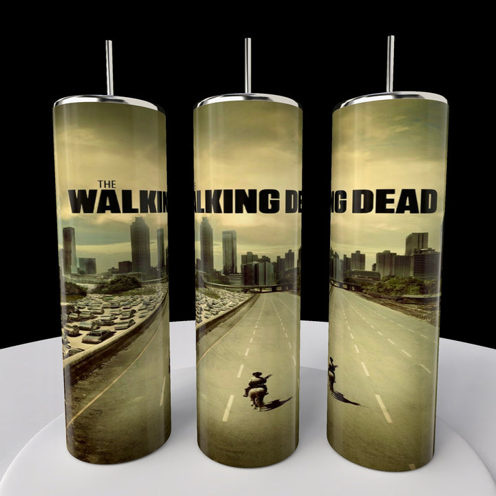 Kreative Kreationz's The Walking Dead 20oz Skinny Tumblers feature an eco-friendly design of an apocalyptic cityscape with a lone figure on horseback navigating a traffic-jammed highway under cloudy skies.