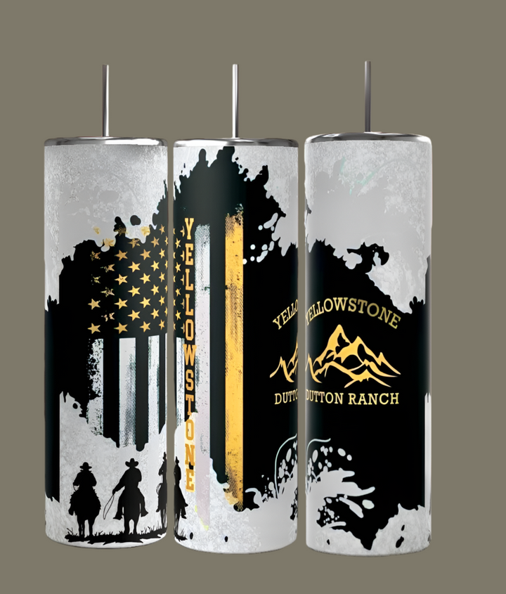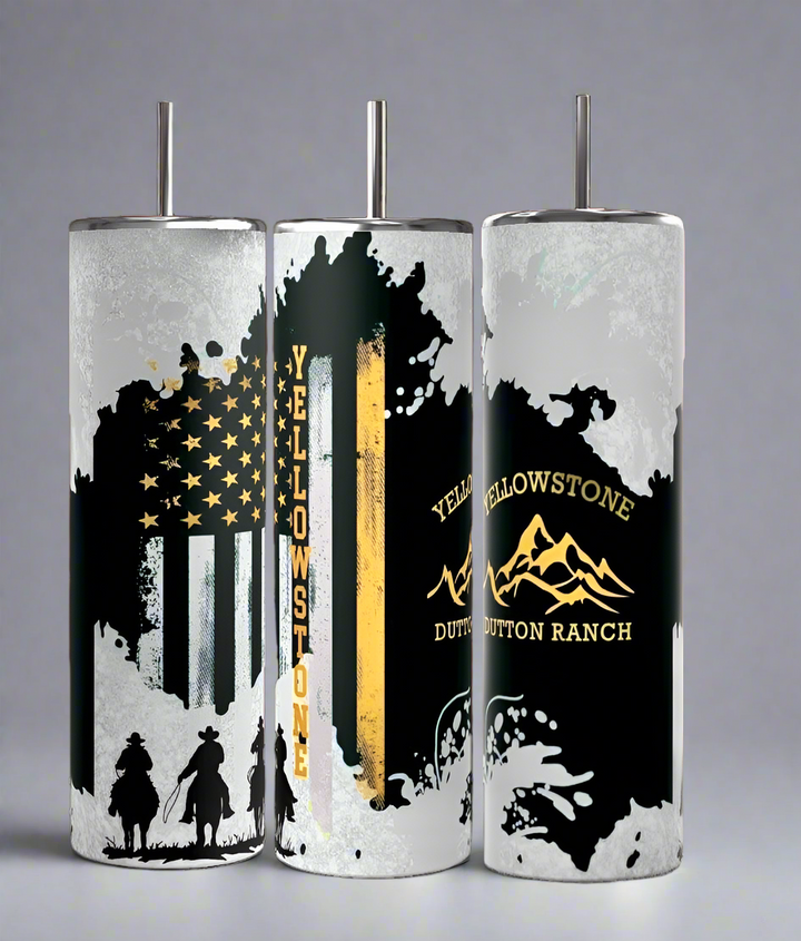 Kreative Kreationz's Yellowstone 20oz Tumblers come in three luxury designs: one with cowboy silhouettes and a USA flag with "Yellowstone," another featuring bold vertical "Yellowstone" text, and the last displaying mountains with "Yellowstone Dutton Ranch.